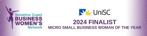 Sunshine Coast Business Women's Network 2024 finalist badge for Micro Small Business Woman of the Year, with logos of Sunshine Coast Business Women's Network and UniSC.